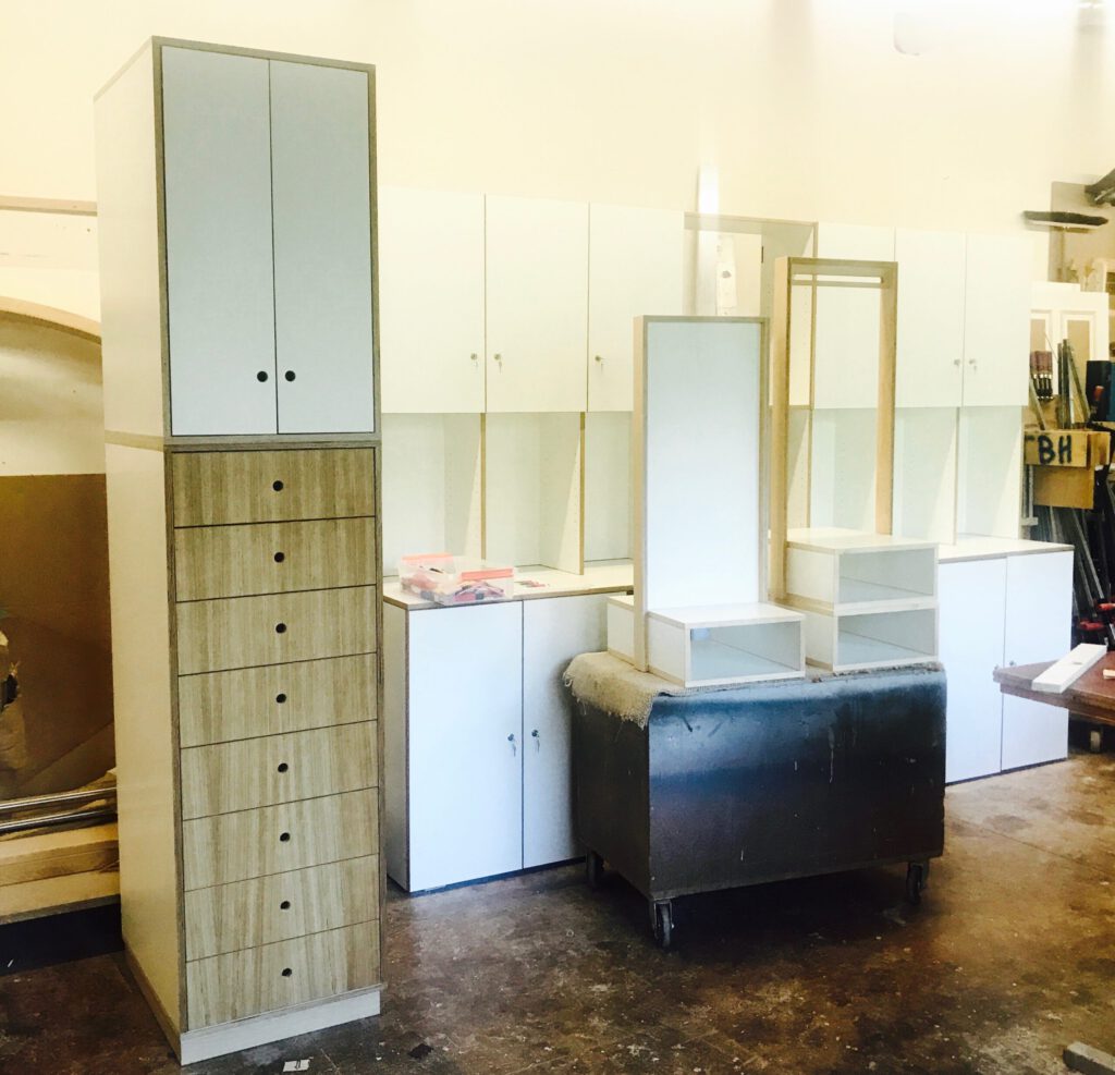 Manche Aufträge sind mühselig und schön. In diesem Fall ein Schubkastenschrank für eine Niesche. 8 Schubkästen reihen sich in einem weißem Multiplex Corpus über einander. Darüber folgt ein weiterer Corpus, der durch zwei schmale Türen Stauraum bietet. Die Schubkästen Vorderstücke sind aus einem Stück angefertigt, so dass sich die Maserung der Eiche als Bild präsentiert. Weinger ist mehr.