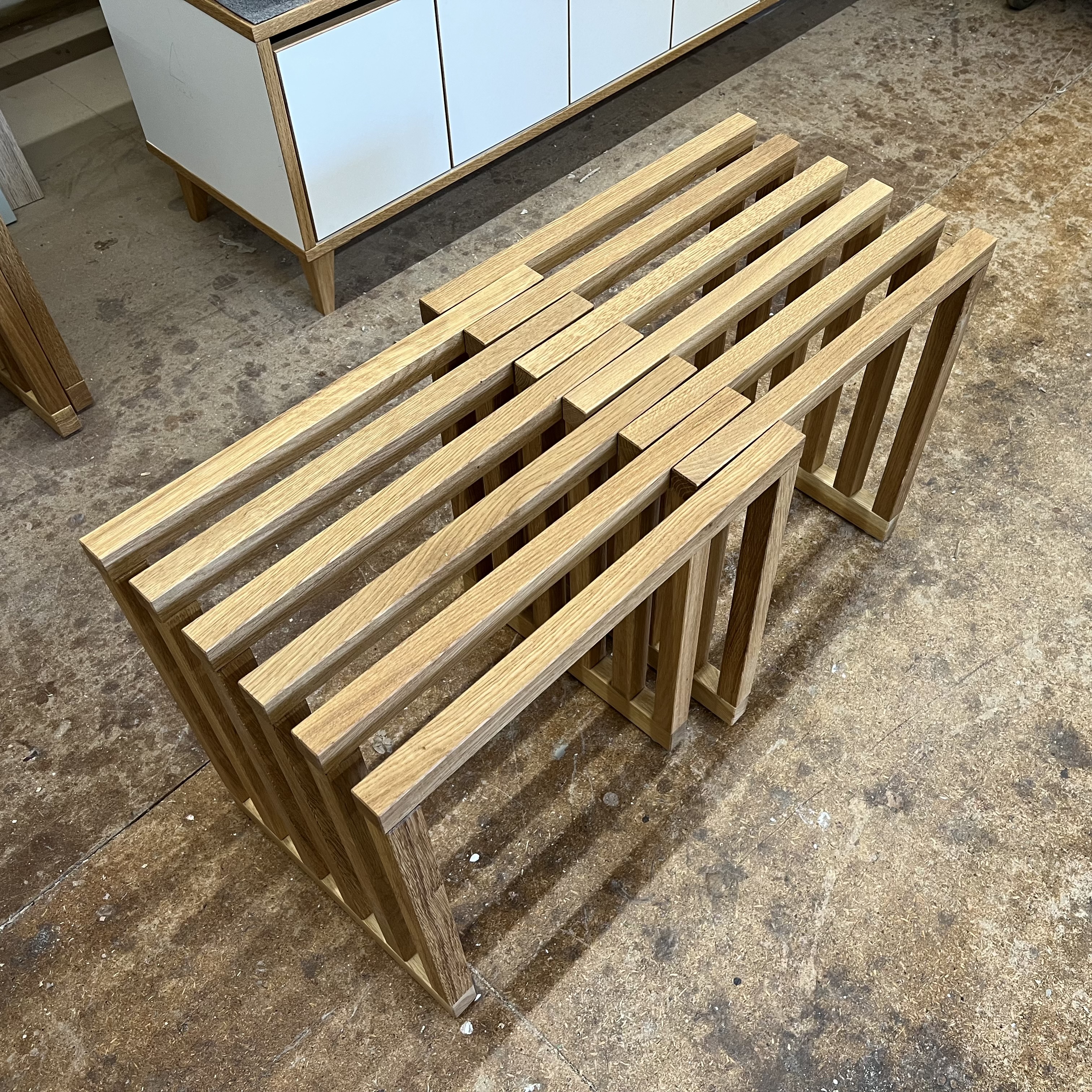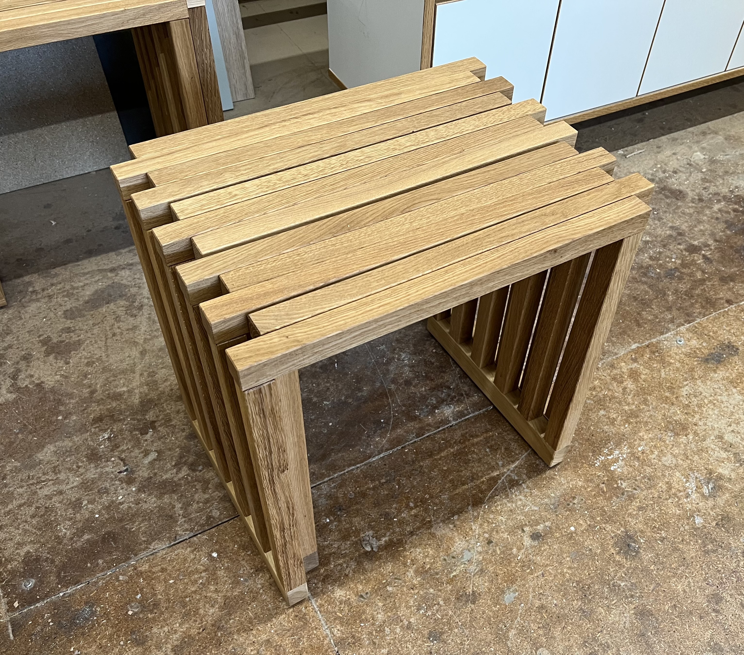 Dieser ausziehbare Hocker Yin Yang läßt sich stufenlos von 45 cm auf 84 cm ausziehen. Der Hocker ist 45,5 cm hoch und ist aus europäischer Eiche angefertigt. Der Hocker ist eine Sonderanfertigung, die anstatt mit einer Schlitz und Zapfenverbindung an den Ecken mit einer klassischen Dübel Holzverbindung angefertigt ist.