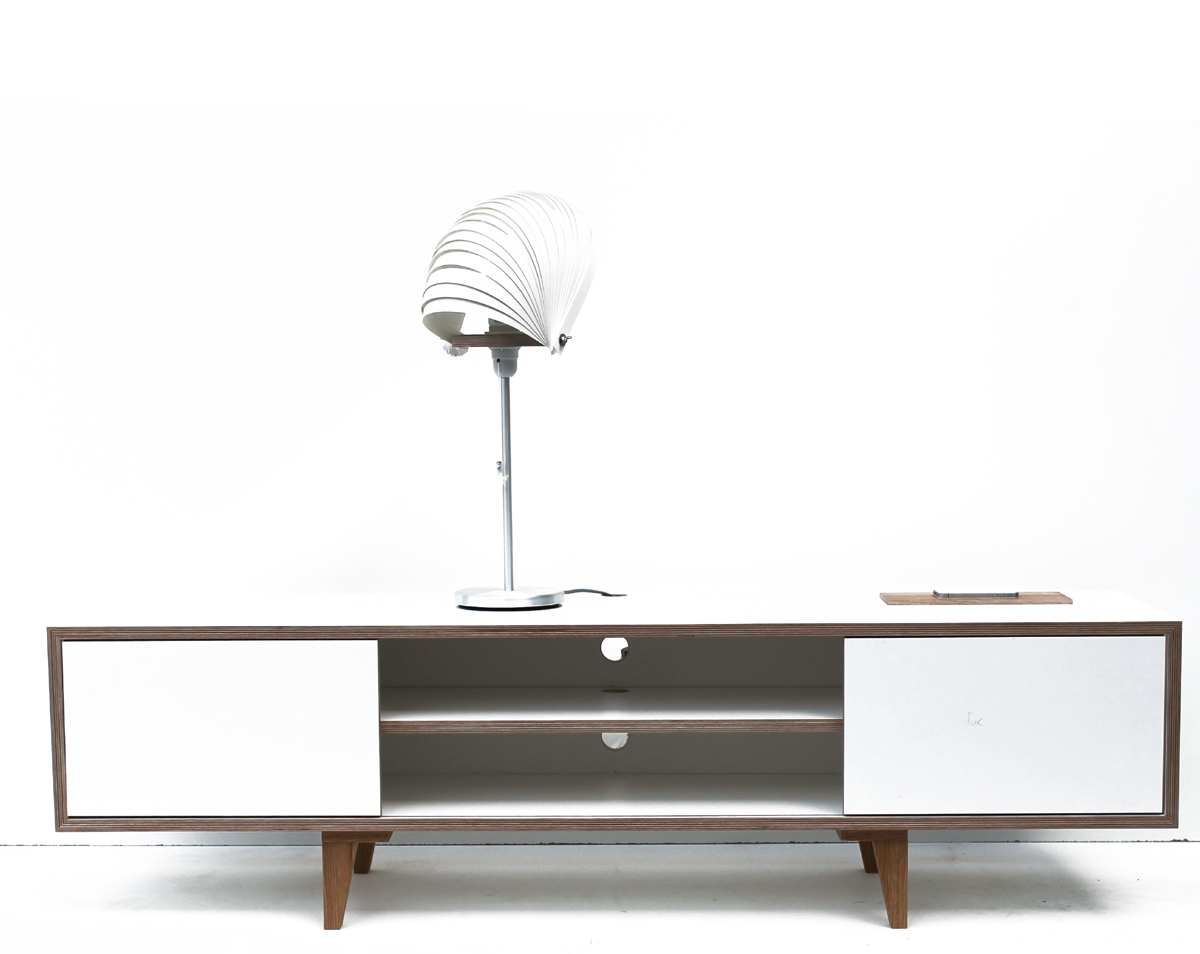 Der TV Tisch Schimmelreiter 42 ist nun wirklich weiß. Der Korpus und Schiebetüren sind aus weißer Multiplex Platte angefertigt. Der Zwischenboden weist wie die Rückwand ein 40 mm Loch auf um die Kabelführung zu Ordnen. Auch ist die Rückwand 7 cm nach Innen versprungen, so dass sie als Blende dient und von dort die Mehrfachsteckdose bedient. Das Holz bezieht sich auf die Stollen.