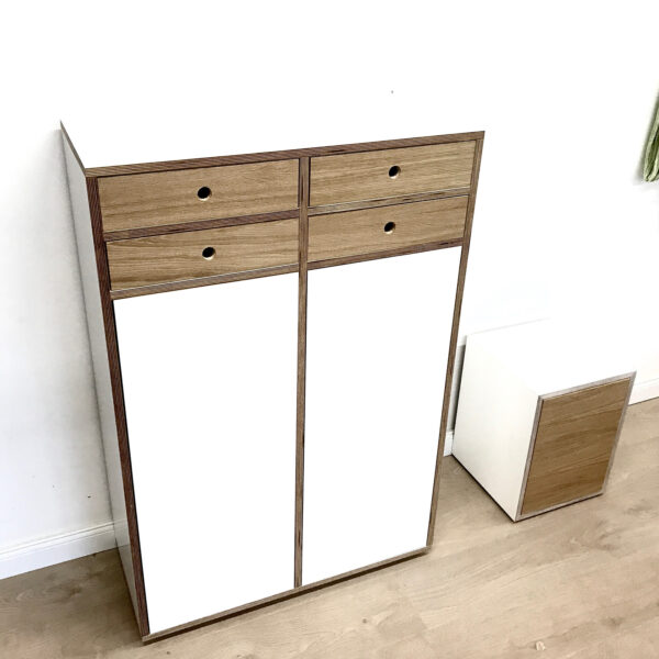 Der Korpus und die Türen sind aus Multiplex gefertigt, die vier Schubkisten bestehen aus Tischlerplatte, die mit Eiche massiv furniert wurde.