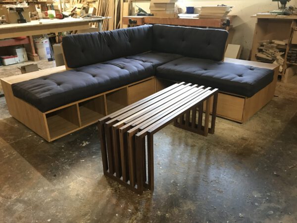 Grundlage des Sofas Tudock 196 ist zum einen, gemütliche Sitzgelegenheiten zu schaffen, zum anderen Stauraum für Dinge zu bieten, die im Alltag begleiten. Stauraum und Sofa in einem Wohnelement. Das Sofa Tudock weist auch auf den Rückseiten der Elemente Regalfläche auf, so dass die Sitzlandschaft in allen Ansichten als Raumtrenner eingesetzt werden kann. Die Bepolsterung stammt aus der Matratzen Manufactur Oasia und ist aus Kokos-Baumwolle mit Rosshaar und einem Latexkern ausgestattet. Der Bezug der Polster kann auf Anfrage gewählt werden. Durch die hochwertigen Polster, kann das Sofa auch als komfortables Gästebett benutzt werden.