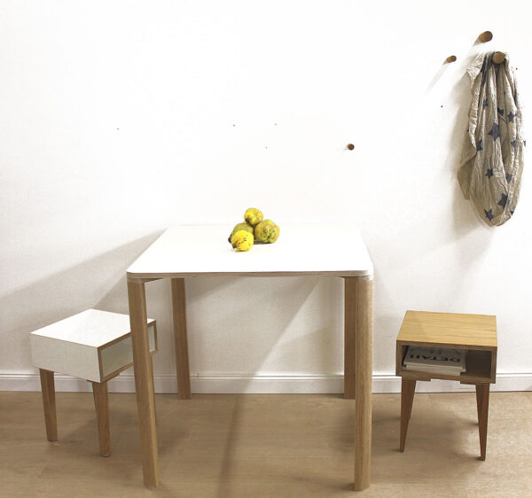 Der Küchentisch Oslo 84 besitzt eine skandinavische Schlichtheit. Eine weiß beschichtete Multiplexplatte und vier Beine, mehr benötigt ein Tisch nicht. Die Ecken der Multiplex Tischplatte sind mit einem großzügigen Radius versehen, der sich auch im Tischbein fortsetzt. Durch seine schlichte Form passt der Küchentisch sich in jede Umgebung ein und ist mit seinem zeitlosem Design ein schöner und ruhiger Begleiter.